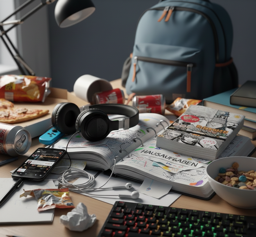 Suche dir zuhause einen passenden Ort, an dem du immer lernst. So kann sich dein Gehirn darauf einstellen, dass wenn du an diesem Ort bist, du jetzt anfängst zu lernen. Dies unterstützt dich für eine bessere Konzentration. Beachte, dass du an deinem Lernort ungestört sein sollst, du genügend Licht hast und dich wohl fühlst. Auch Ordnung ist – wie bereits in deinem Heft – hilfreich. Unordnung lenkt ab und stört bei der Konzentration.